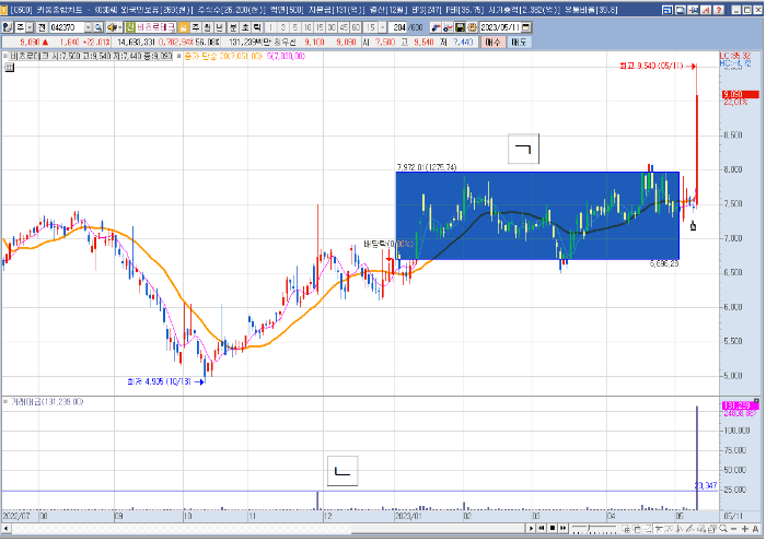비츠로테크 오늘 좋은 모습을 보여주었습니다. 일봉상으로 (ㄱ) 박스권 돌파, (ㄴ) 거래대금 전고점 돌파, 20일 이평선