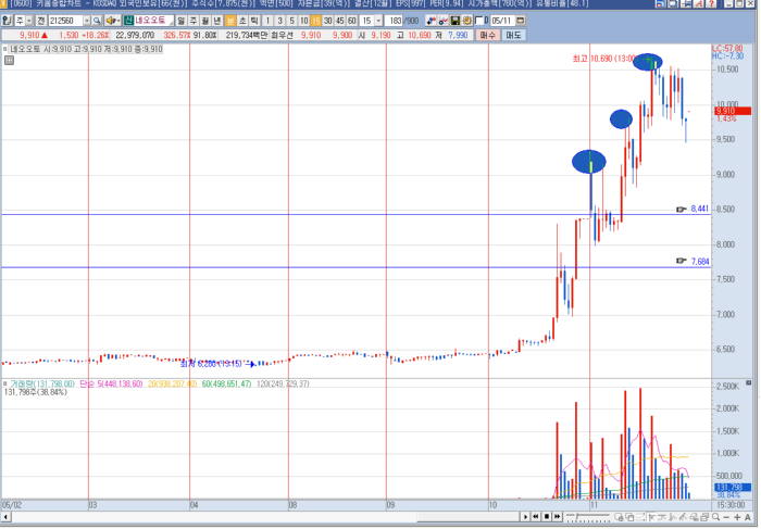 네오오토 분봉에서 어제처럼 (전고점갱신 > 매물소화 > 다시 전고점갱신)의 모습을 보여주어 상승의 힘을 보여주었습니다.