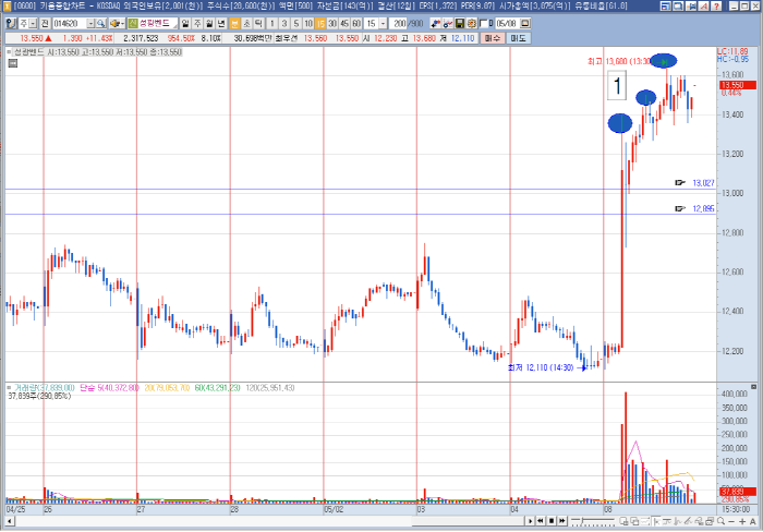 다음 거래일에 1번의 고점을 강하게 돌파하고 장을 마감한다면 중기적인 상승도 기대해 볼만하겠습니다.